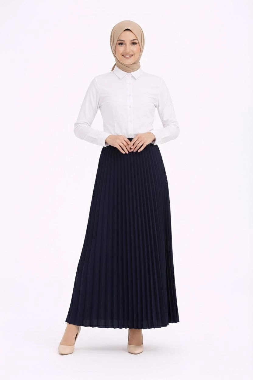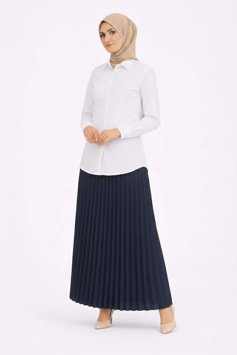 Tesettür Beyaz Gömlekli Pliseli Etek İkili Takım Gündelik ve Ofis Şıklığı – Lacivert