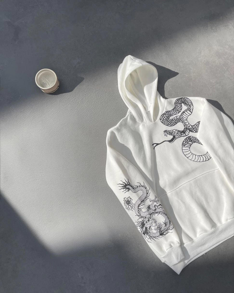 Uzun Kol Kapüşonlu Baskılı SweatShirt – Beyaz